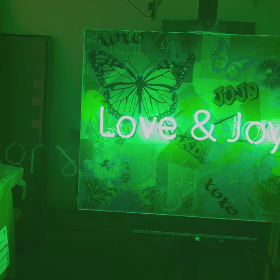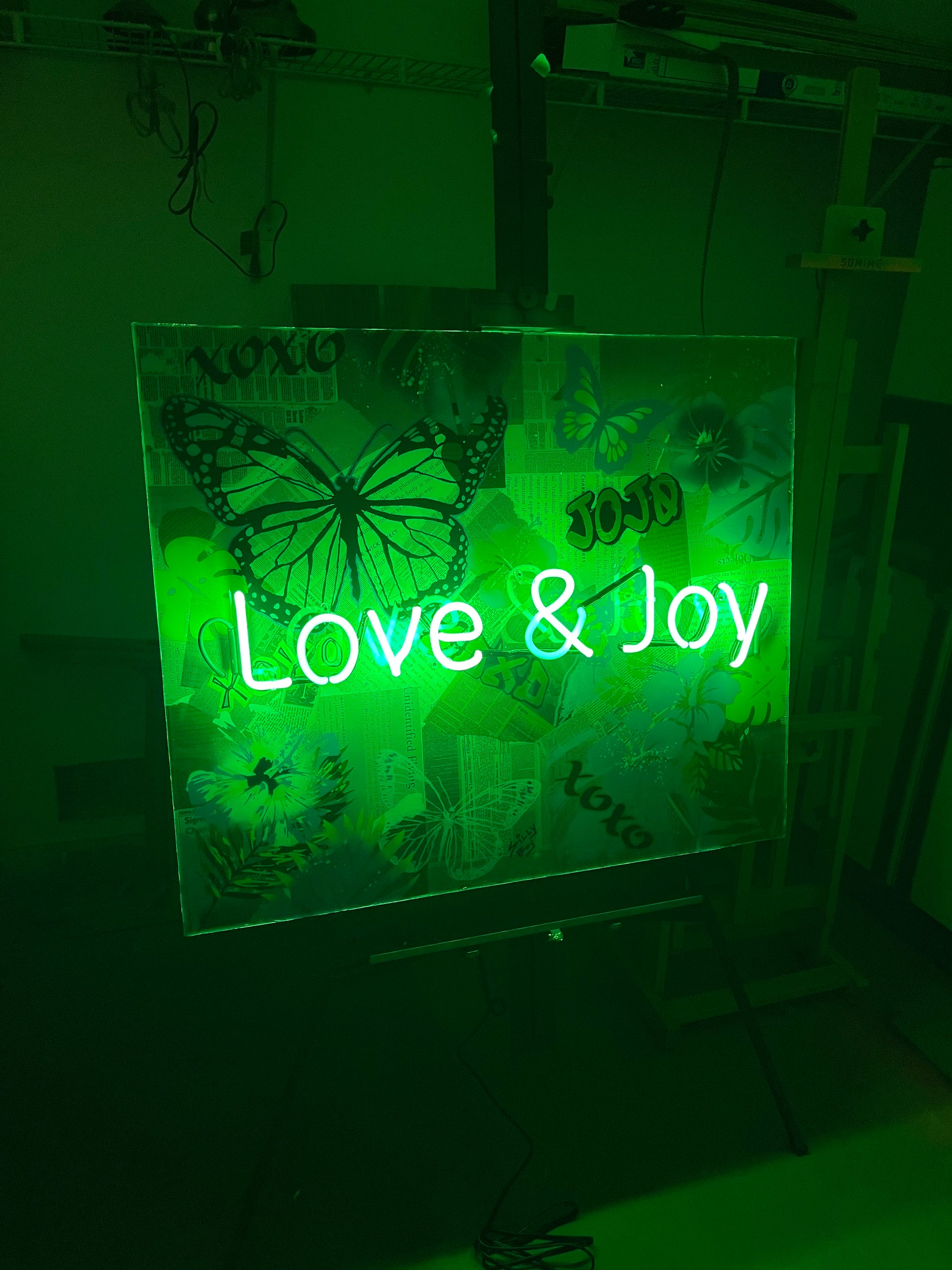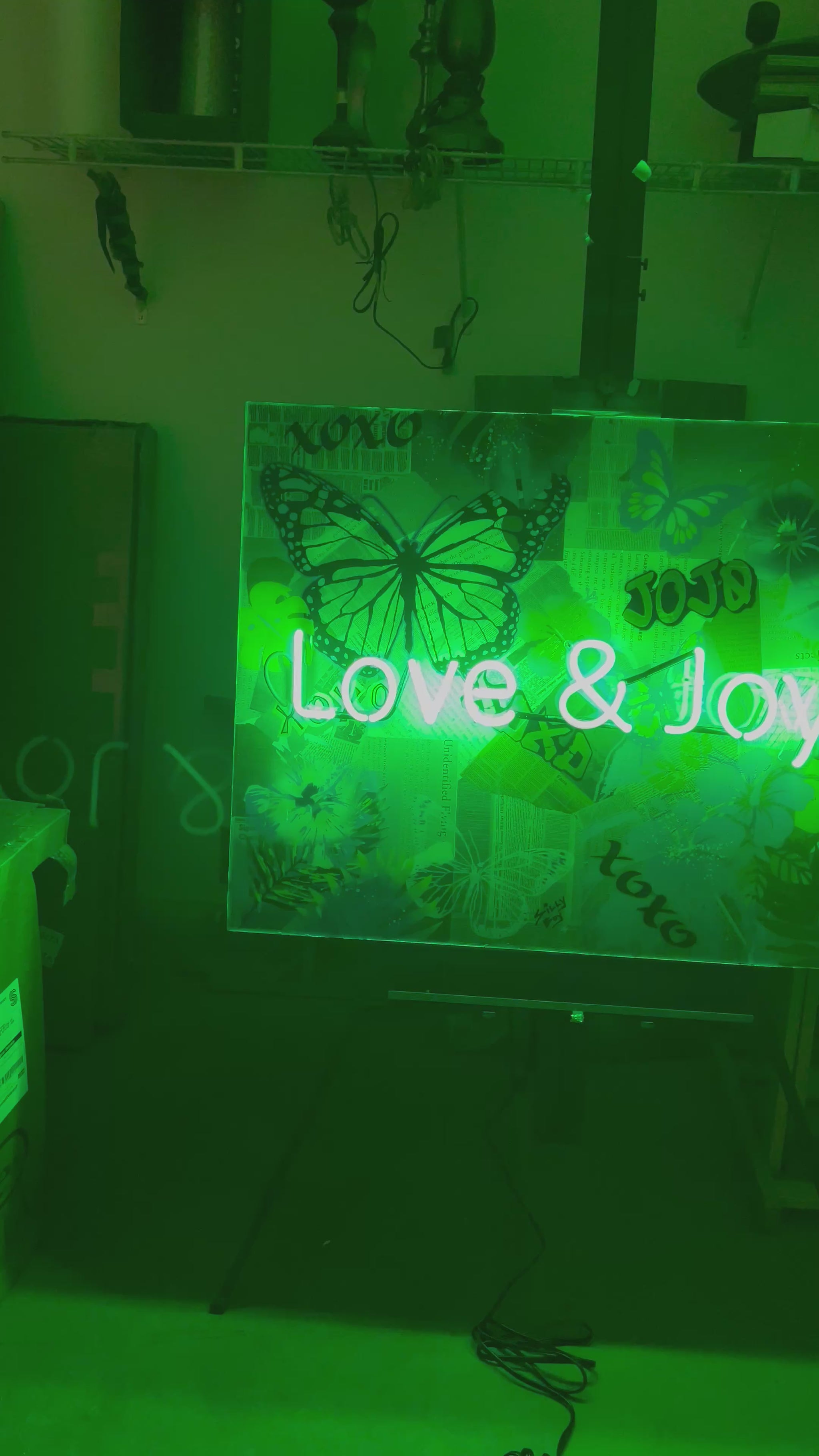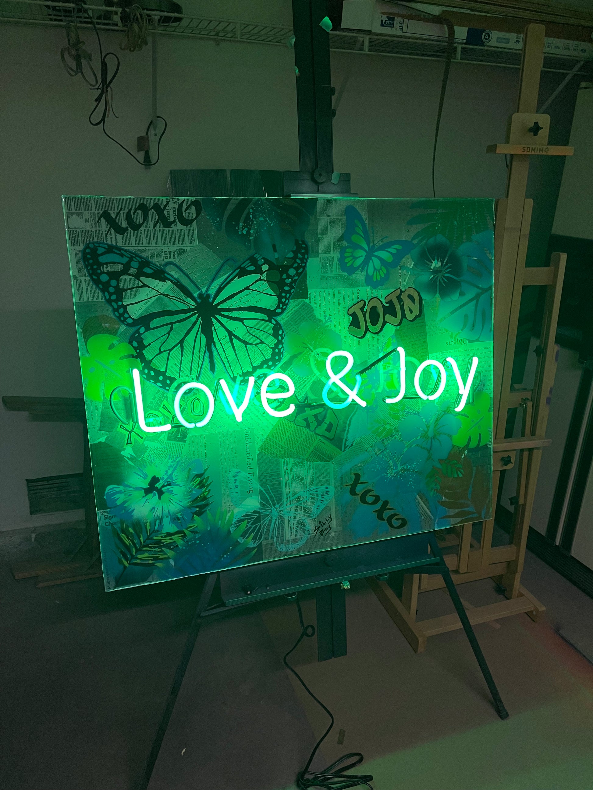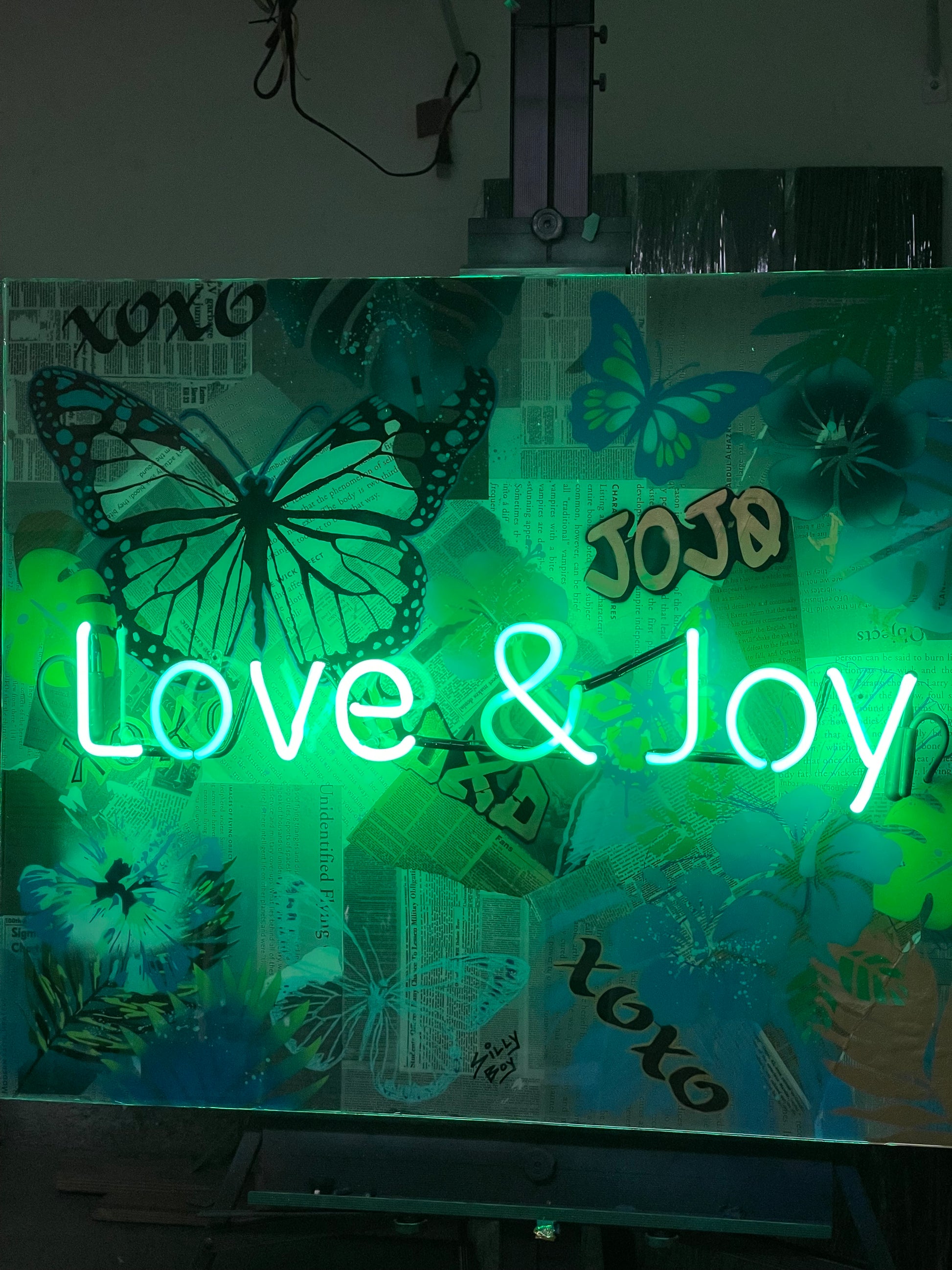 Introducing “FLUTTER & INK 2” — a 36x30 burst of nostalgia and nature: vintage newspaper clippings smothered in butterflies, hibiscus, and palm leaves, all kissed by a neon green glow bright enough to make your plants jealous.