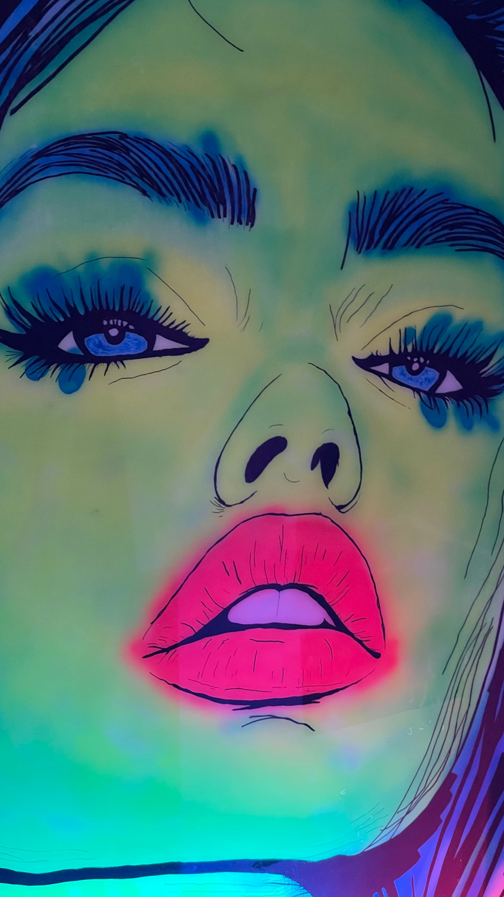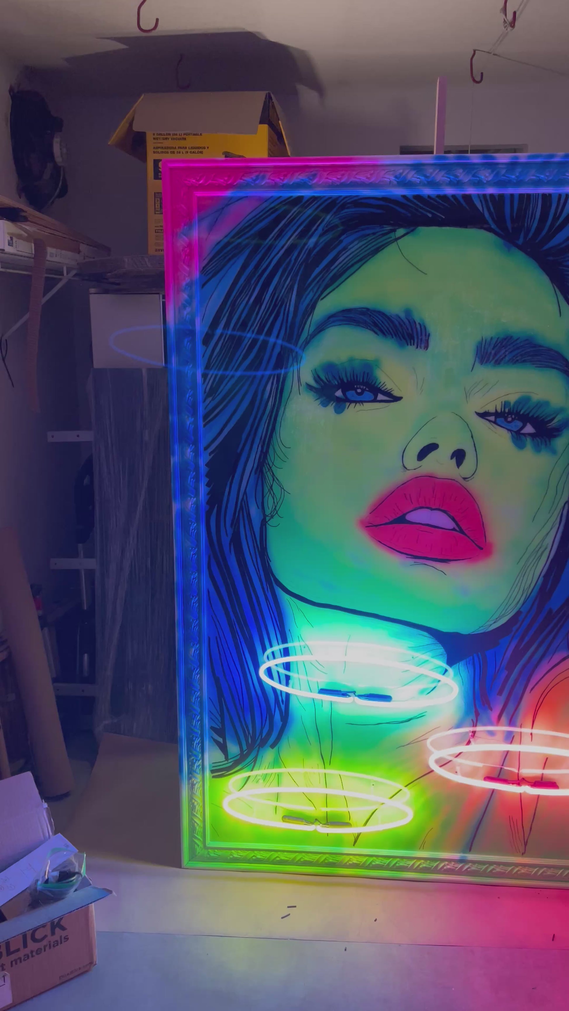 "LADY LUCK'S EMBRACE"—a 48x72 neon spectacle proving once and for all that bigger is, in fact, better. A fluorescent fever dream of color, wrapped in three glowing oval rings—but what do they mean? A cosmic message? A secret code? Maybe just a subtle nod to the stacks of poker chips fueling a damn good cause.